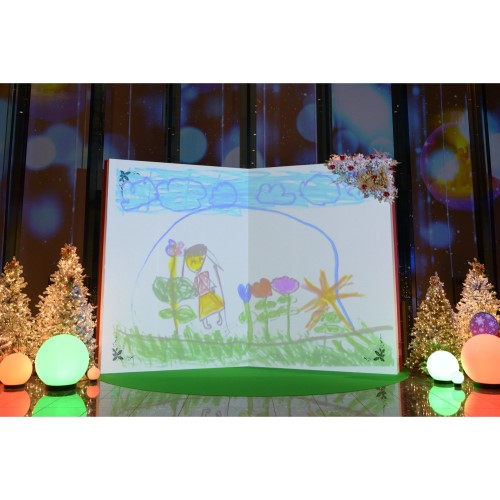 巨大絵本に見立てたスクリーンに園児が描いたイラストを投影!